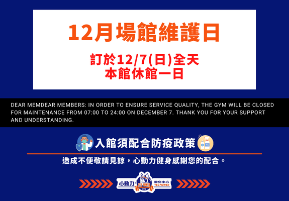 Dear Members: The Mid-Autumn Festival is open for holidays.To ensure the service quality, Gym is scheduled to close for maintenance from 07:00~24:00 on December 7 ,We appreciate your support & understanding.