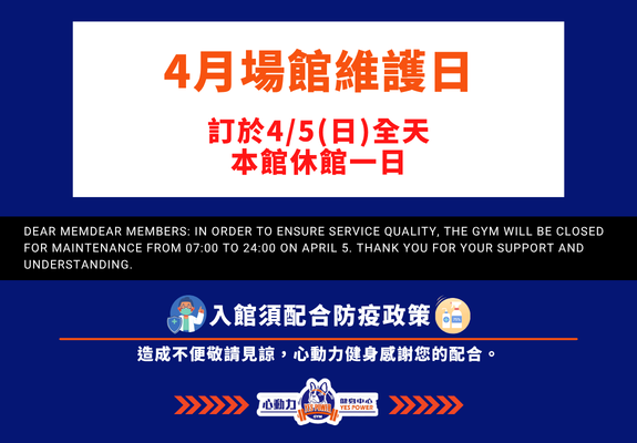 Dear Members: The Mid-Autumn Festival is open for holidays.To ensure the service quality, Gym is scheduled to close for maintenance from 07:00~24:00 on April 5 ,We appreciate your support & understanding.